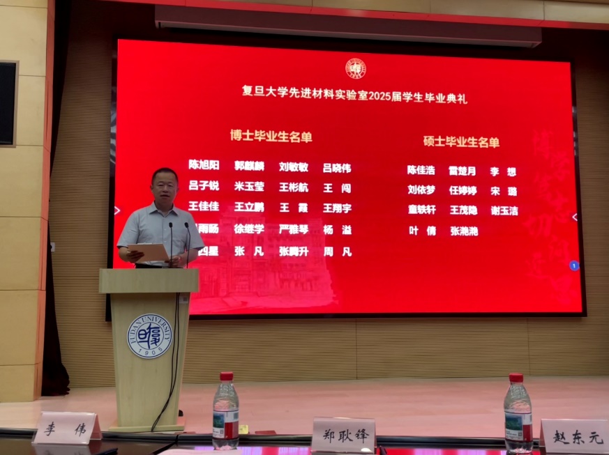 202566日下午,复旦大学先进材料实验室2025届学生毕业典礼暨学长学姐欢送会在江湾校区先进材料楼隆重举行。先进材料实验室党政领导、导师代表、教职工代表以及毕业生亲友等共同出席了此次活动,见证这一重要时刻。活动由先进材料实验室党总支副书记汪敏主持。
