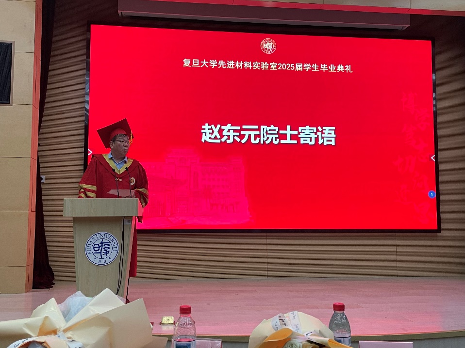 最后,中国科学院院士、先进材料实验室主任赵东元教授为毕业生拨穗并寄语。2025年注定是变革之年,复旦大学六大创新学院建设如火如荼,新工科发展进入快车道。今年是先进材料实验室成立20周年,作为教育部“985工程”二期重点建设的科技创新平台,实验室成立之初的建设理念和发展模式便与复旦“六创”不谋而合。先进材料实验室在融入智能材料与未来能源创新学院建设的同时,将打开事业发展新局面、不断发展壮大。赵院士提到自己回国27年一直专注于功能介孔材料领域,从基础科学研究拓展到应用技术开发,再延伸到标准制定领域的历程。他从自身科研经历鼓励毕业生:保持求知欲,终身学习勇于创新,敢于突破传承复旦精神,做一个“卓越而有趣”的人