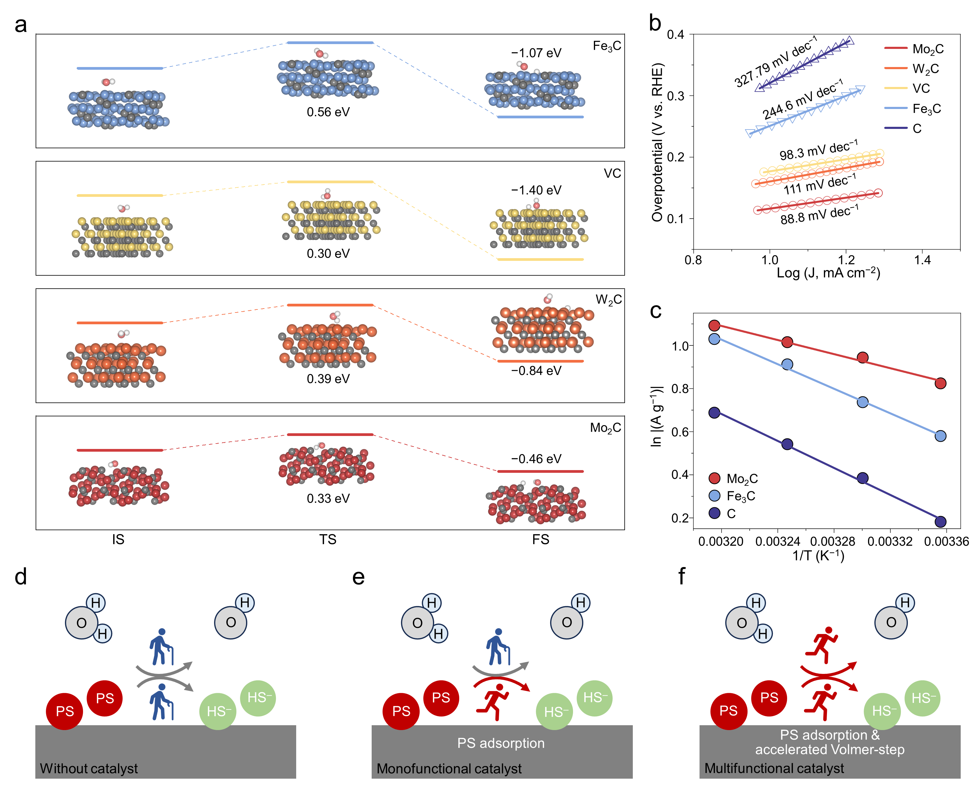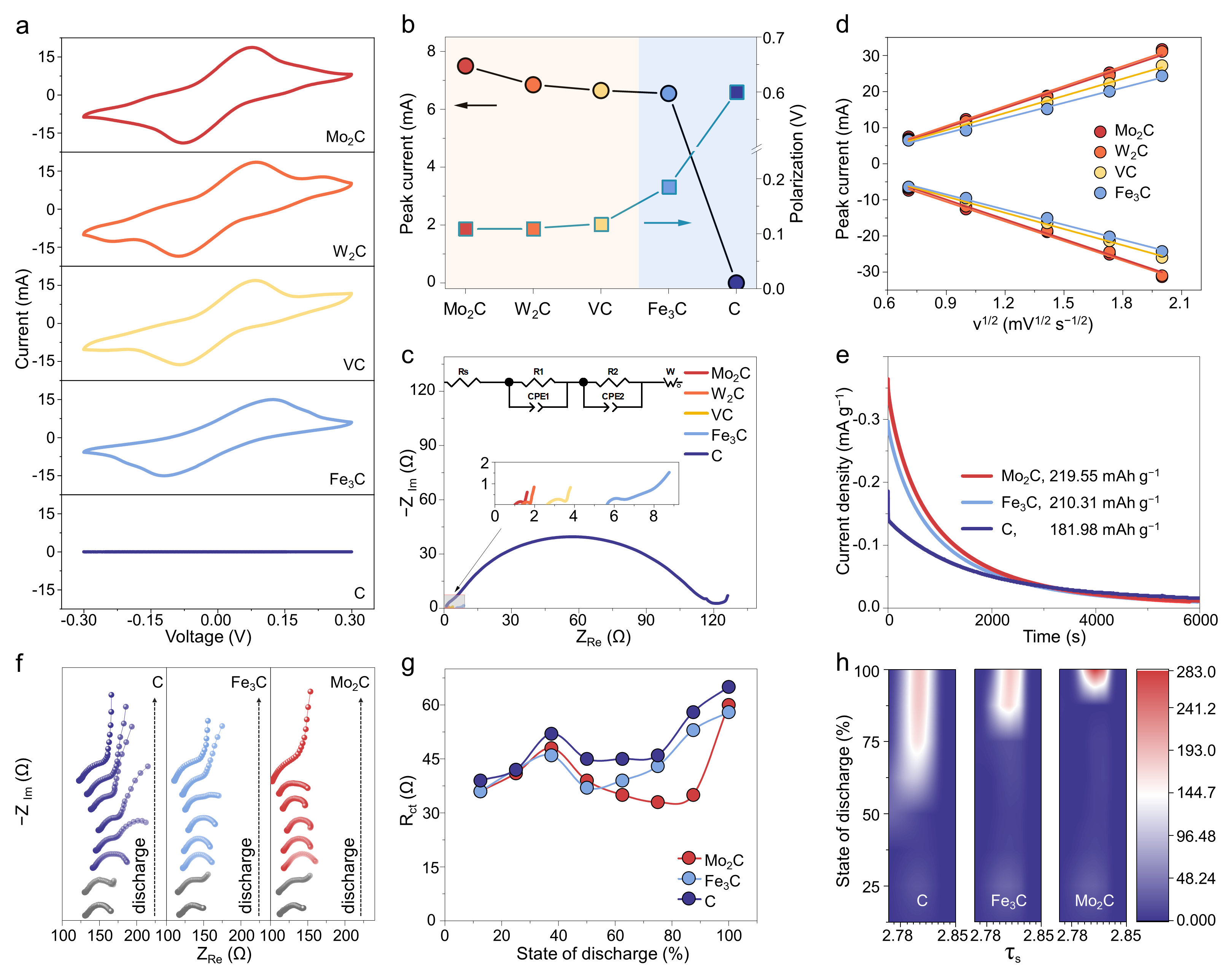 通过分析不同过渡金属碳化物催化剂对水系硫电池电化学反应的催化活性,发现与Fe3C和纯C相比,Mo2C、W2C和VC催化剂表现出对多硫化物转化更优异的催化活性。此外,三种催化活性更优的催化剂主要催化了多硫化物到HS−的转化过程。