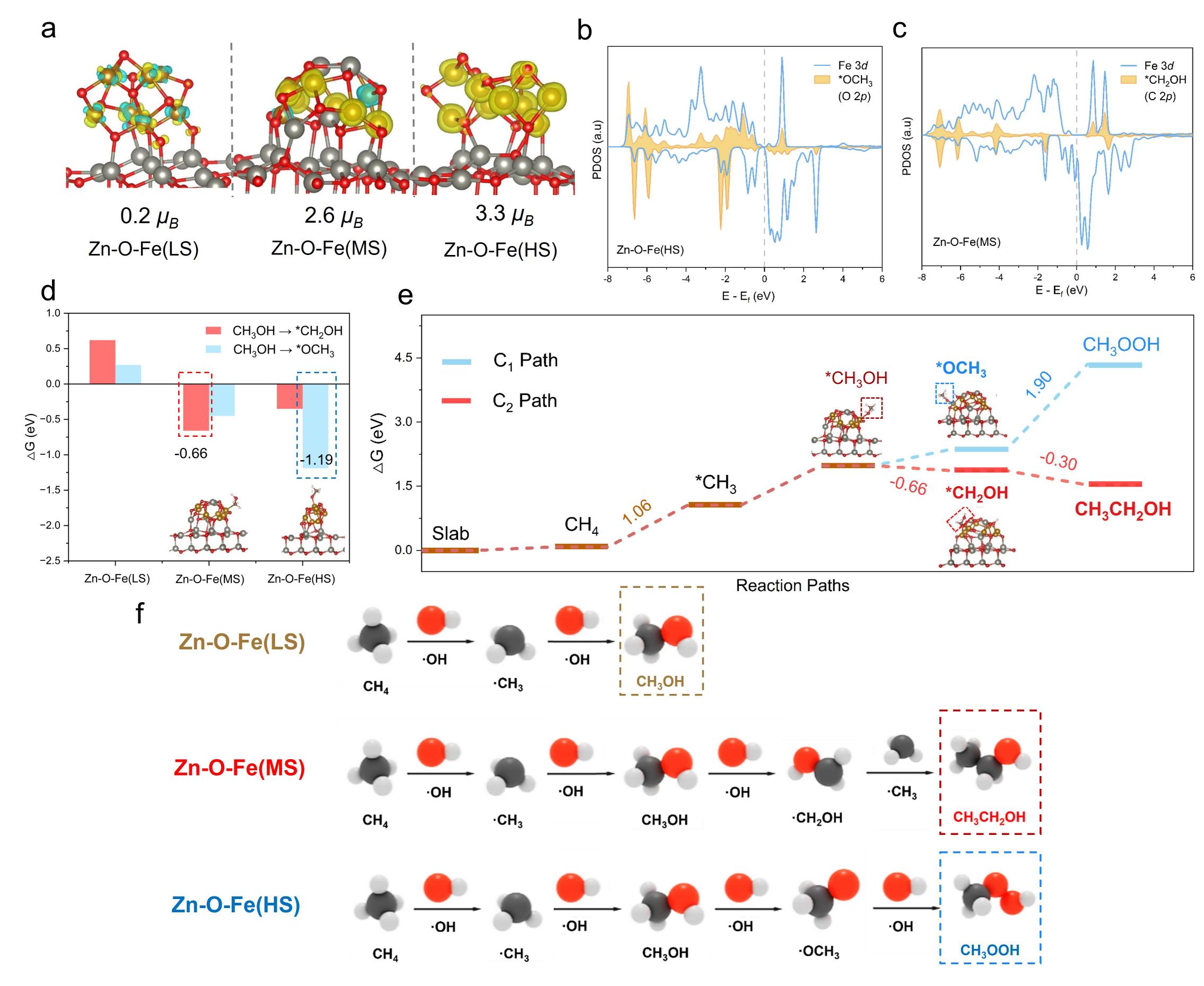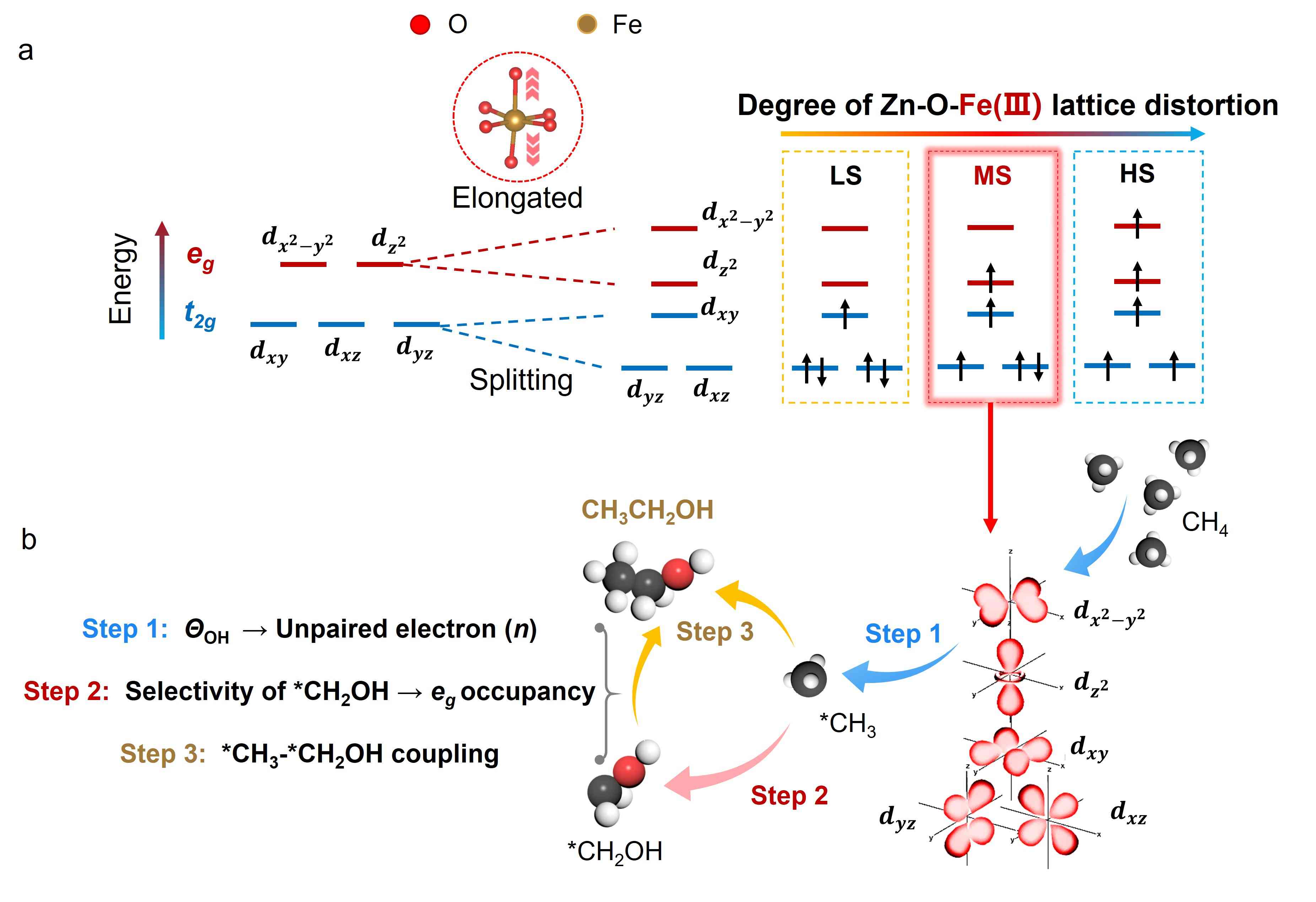图1. (a) 通过调节Zn-O-Fe(III)晶格畸变程度实现Zn-Fe复合氧化物中Fe活性位点自旋态调控的示意图。(b) 中自旋Fe位点的Zn-O-Fe(MS)光催化剂上通过平衡未配对电子数(n)和eg占据描述符实现CH4光催化氧化为CH3CH2OH产物的示意图。
