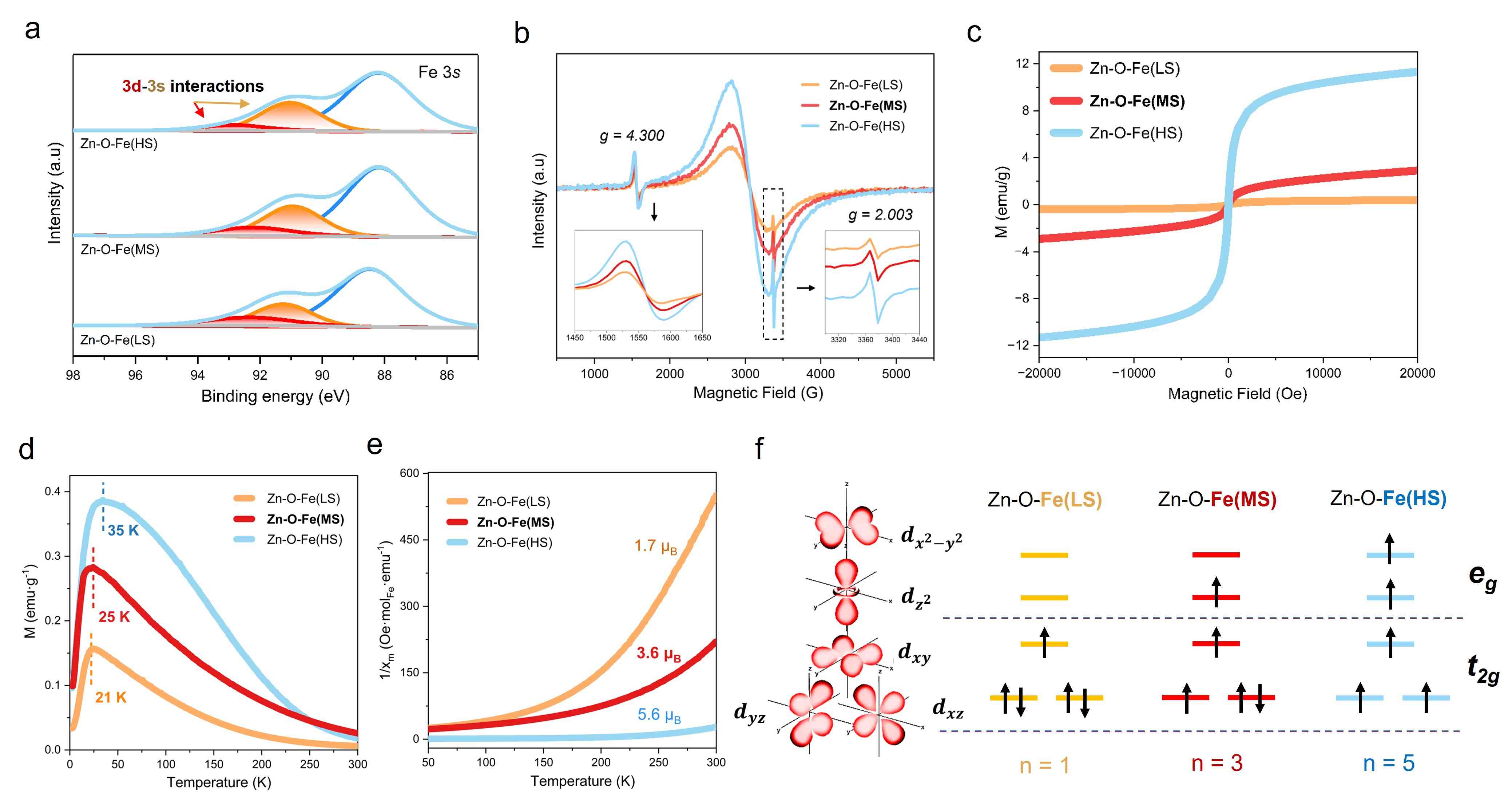 图1. (a) 通过调节Zn-O-Fe(III)晶格畸变程度实现Zn-Fe复合氧化物中Fe活性位点自旋态调控的示意图。(b) 中自旋Fe位点的Zn-O-Fe(MS)光催化剂上通过平衡未配对电子数(n)和eg占据描述符实现CH4光催化氧化为CH3CH2OH产物的示意图。