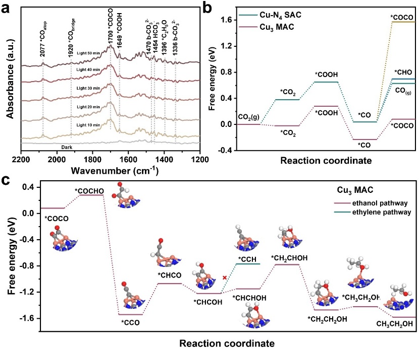 通过Cu3 MAC的原位红外漫反射谱分析,在黑暗条件下CO2与水蒸气吸附30分钟后,观察到1336和1470 cm-1处的双齿碳酸盐(b-CO32-)及1454 cm-1处的碳酸氢盐(HCO3⁻)。光照条件下,1649 cm-1处出现COOH峰(形成CO的关键中间体),2077和1920 cm-1处的峰分别归属于顶位吸附CO(COatop)与桥位吸附CO(CObridge),而Cu-N4 SAC仅检测到COatop峰。此外,Cu₃ MAC在1700 cm-1处的COCO峰,结合COatop与CObridge构型,证实其存在不对称C-C偶联过程。随着光照时间延长,1396 cm-1处*C2H5O特征峰逐渐增强,直接印证乙醇生成路径。