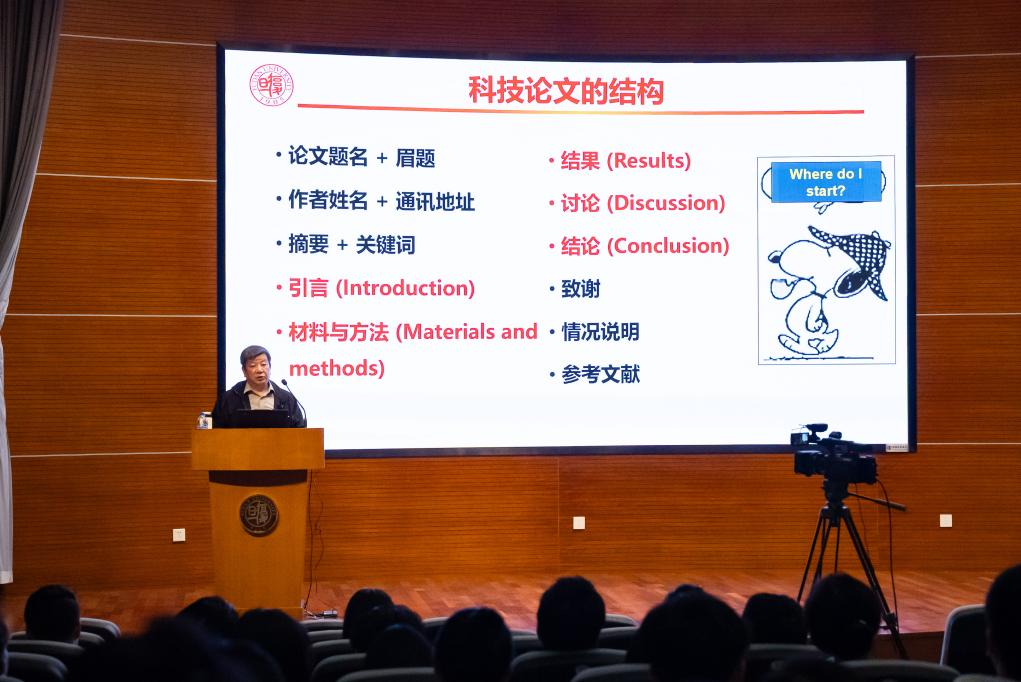 2025325日下午,由复旦大学先进材料实验室团委与研究生会共同主办的“英语科技论文——撰写与投稿”专题讲座(第二讲),继续在江湾校区图书馆报告厅准时开讲,线上线下约400人参加讲座。中国科学院院士、复旦大学化学与材料学院院长赵东元教授继续为师生们传授英语科技论文的写作技巧。