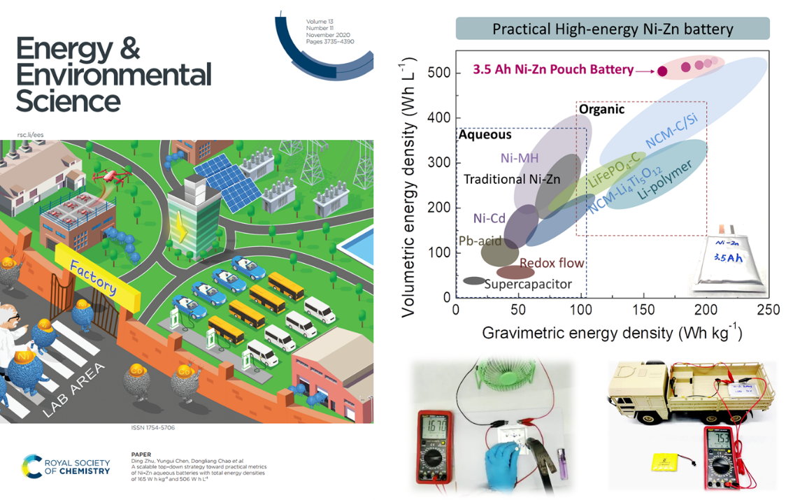 • W. Zhou, D. Zhu*, J. He, J. Li, H. Chen, Y. Chen*, D. Chao*, A Scalable Top-Down Strategy toward Practical Metrics of Ni–Zn Aqueous Batteries with Total Energy Densities of 165 Wh/kg and 506 Wh/L, Energy Environ. Sci., 2020, 11(13): 4157-4167. (ESI Highly Cited paper,Cover paper)