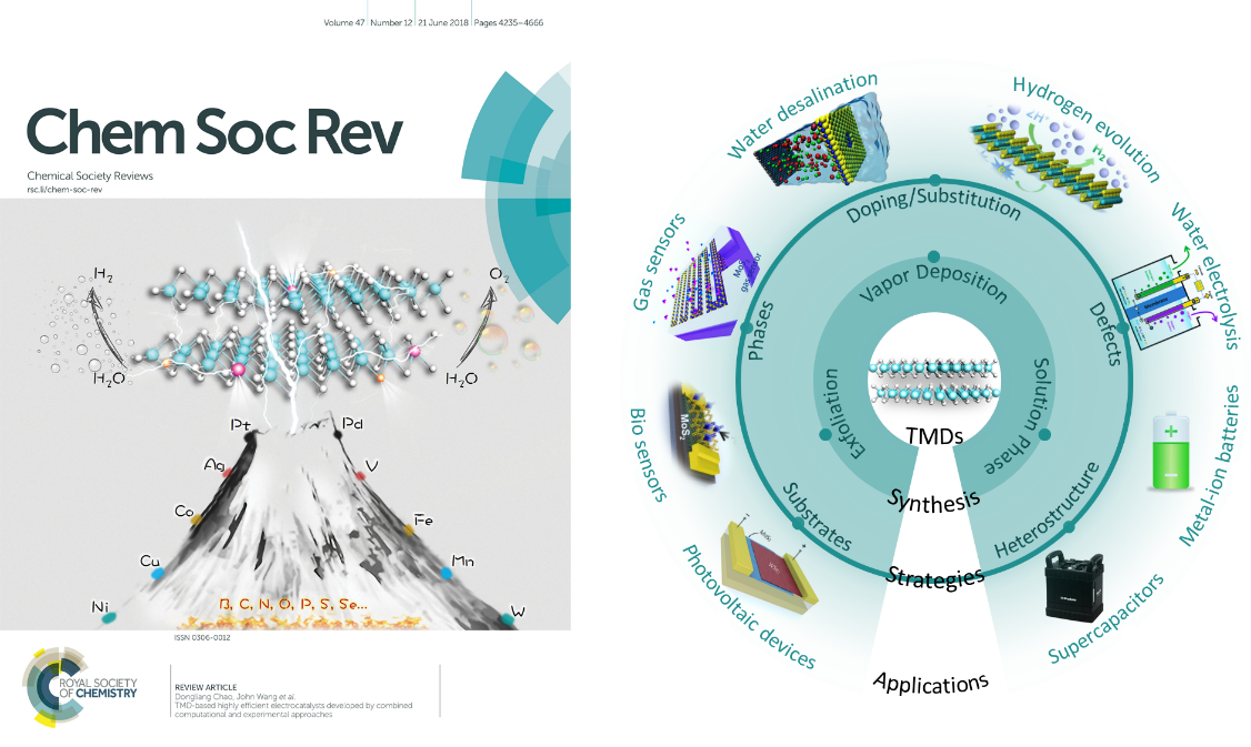 • C. Zhu, D. Gao, J. Ding, D. Chao*, J. Wang*, TMD-based Highly Efficient Electrocatalysts Developed by Combined Computational and Experimental Approaches, Chem. Soc. Rev., 47, 4235 (2018). (ESI Highly Cited paper, Cover paper)