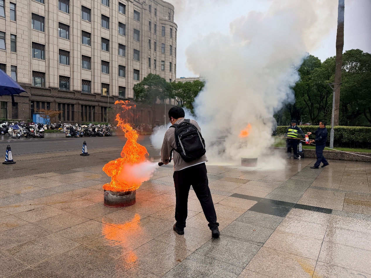 理论讲座结束后,全体参会师生移步至先进材料楼楼前空地,投入到灭火器使用实操演练中。保卫处专业人员首先现场演示了干粉灭火器的正确操作步骤,详细讲解了“提、拔、握、压”四大使用要领以及注意事项。在专业人员的悉心指导下,师生们纷纷踊跃上场,亲身体验了从判断风向、拔掉保险销到对准火焰根部喷射的完整灭火过程。通过“零距离”的实战演练,大家成功将理论知识与实际操作相结合,克服了面对火情时的紧张心理,切实掌握了扑救初起火灾的“硬功夫”。